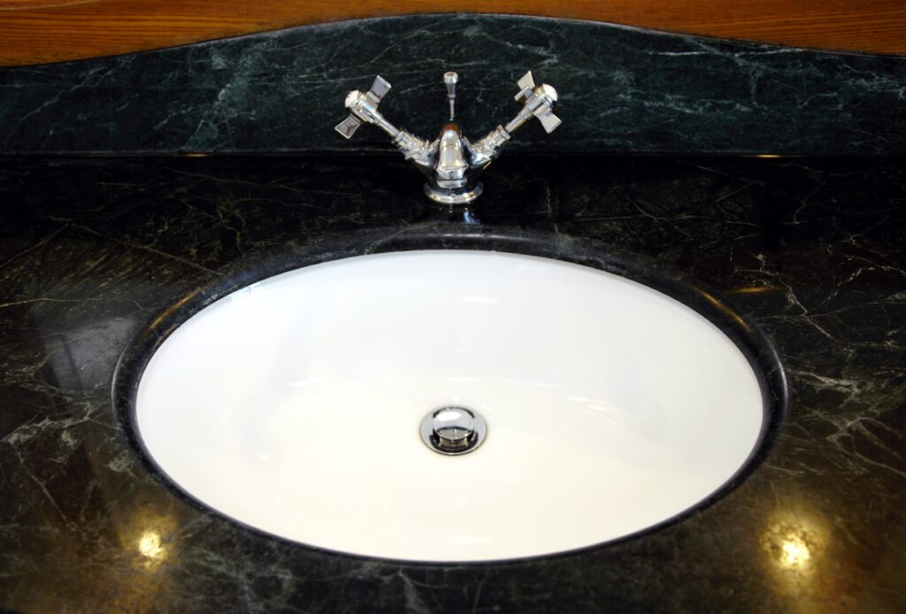 Suite comprising marble top vanity wash-hand basin and bath, toilet,
